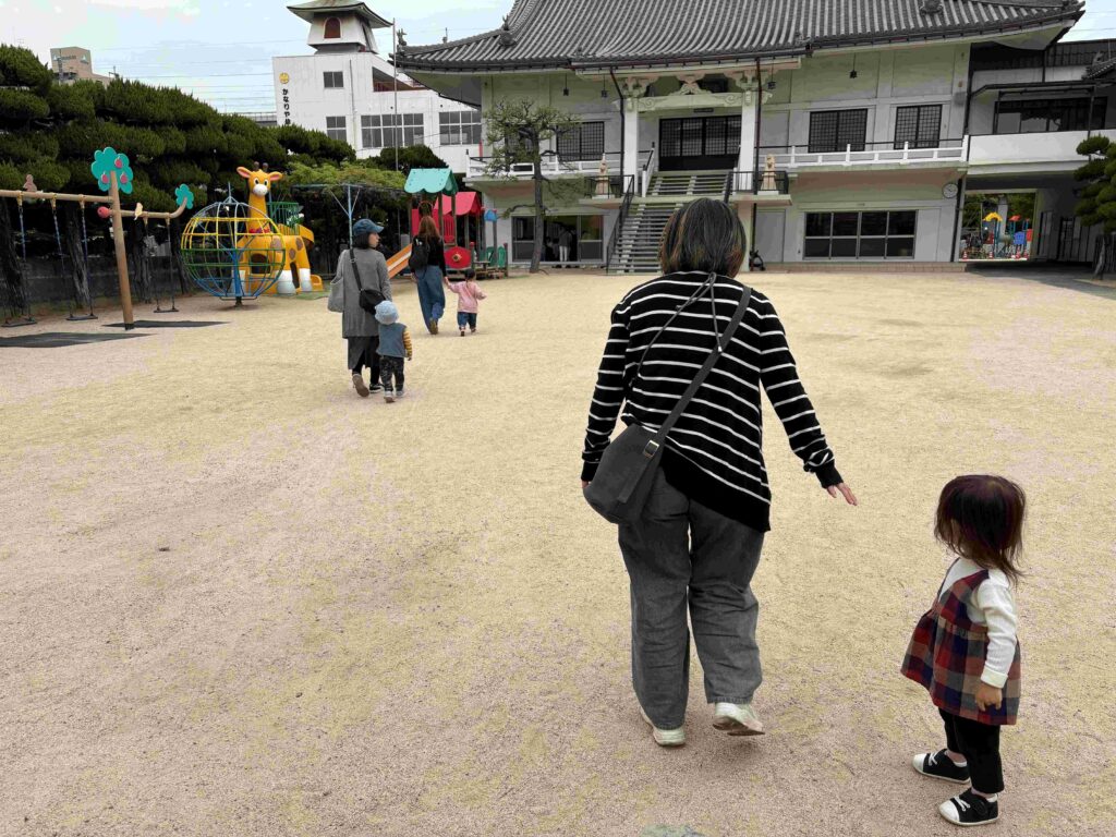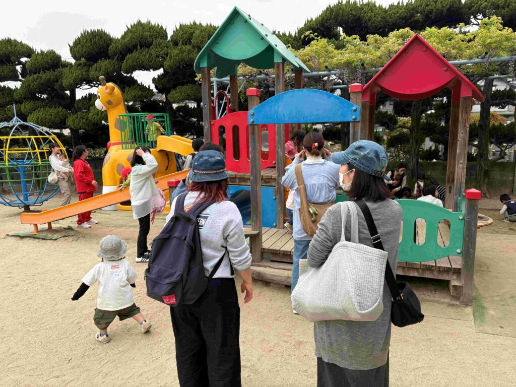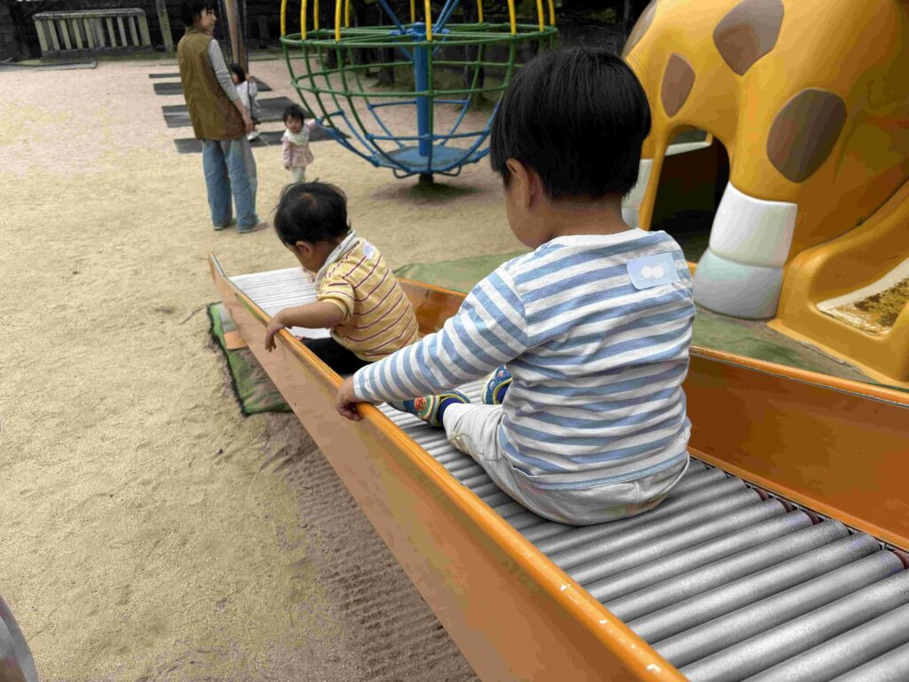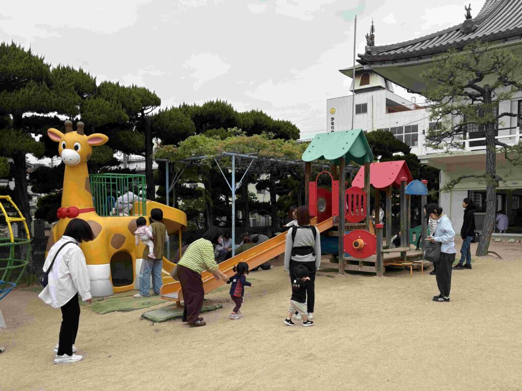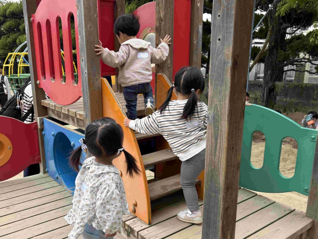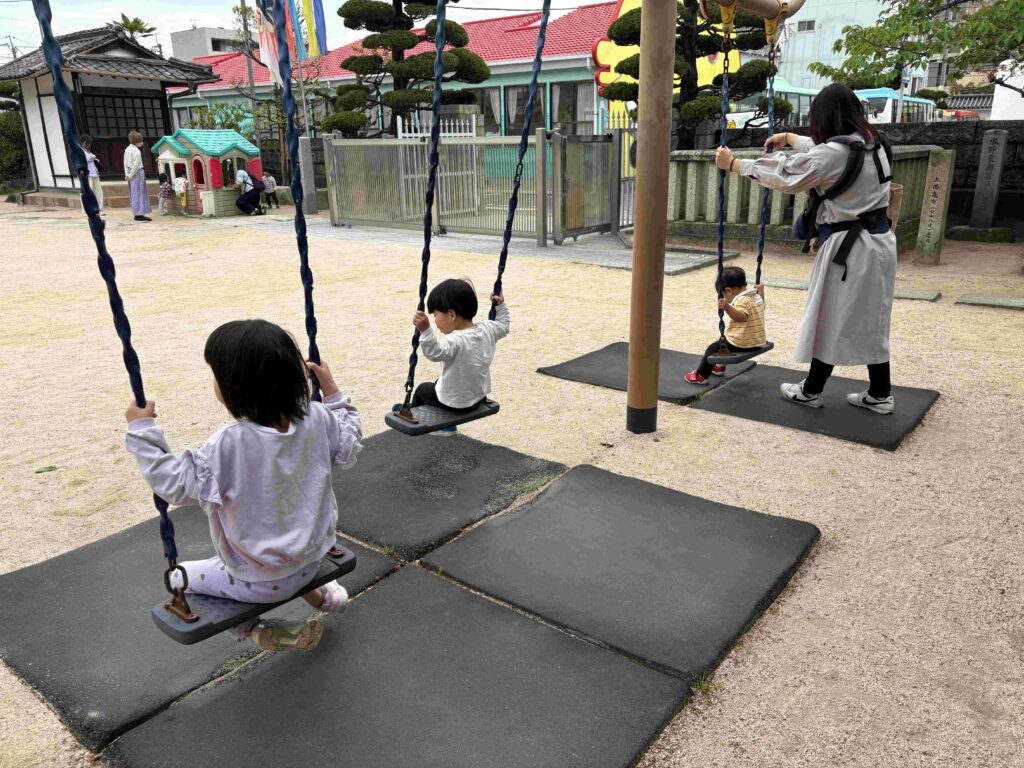 広々とした園庭で遊ぶ時間もあります。ブランコや砂場、たくさんの大型遊具があります。