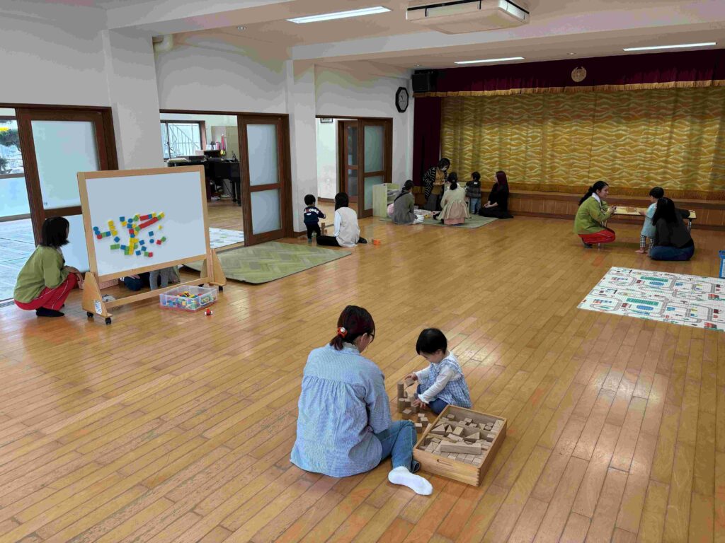 会場は、幼稚園のホールです。たくさんのおもちゃを用意しています。