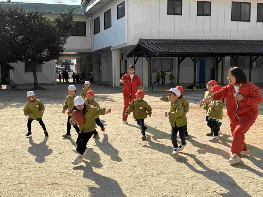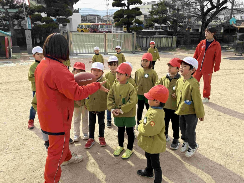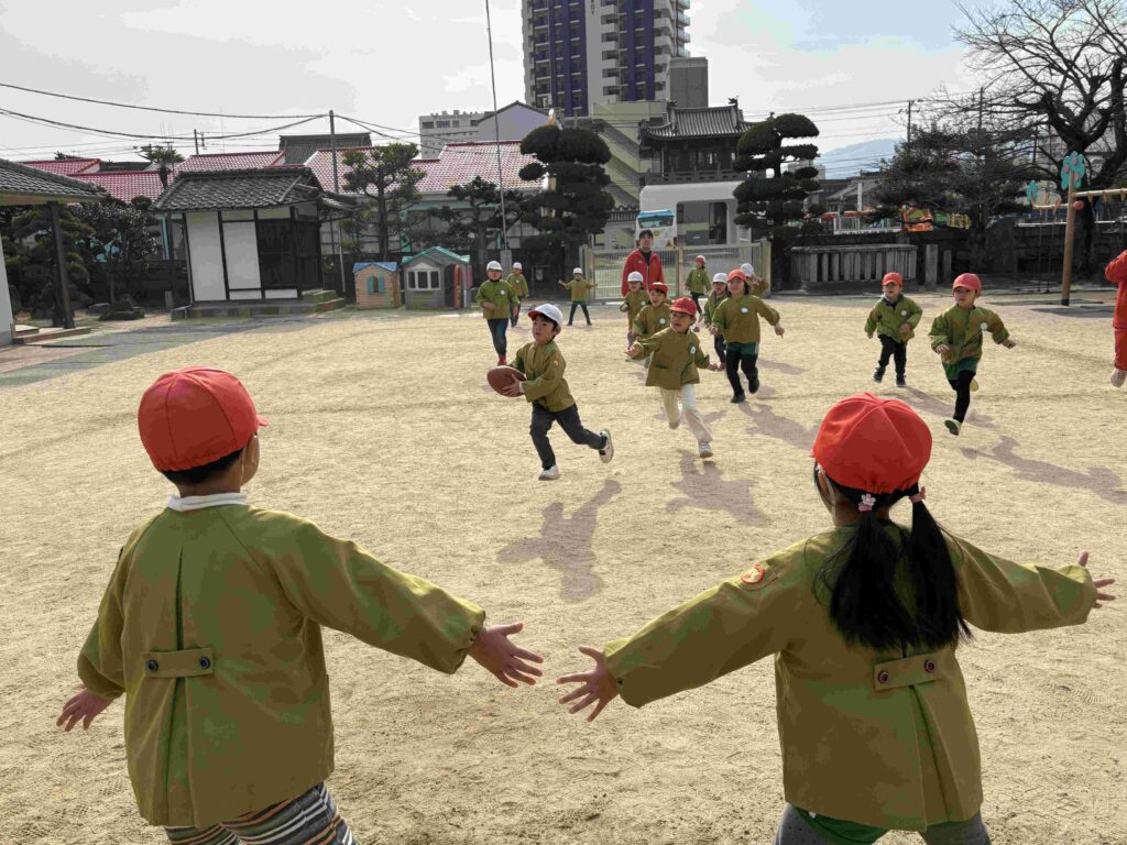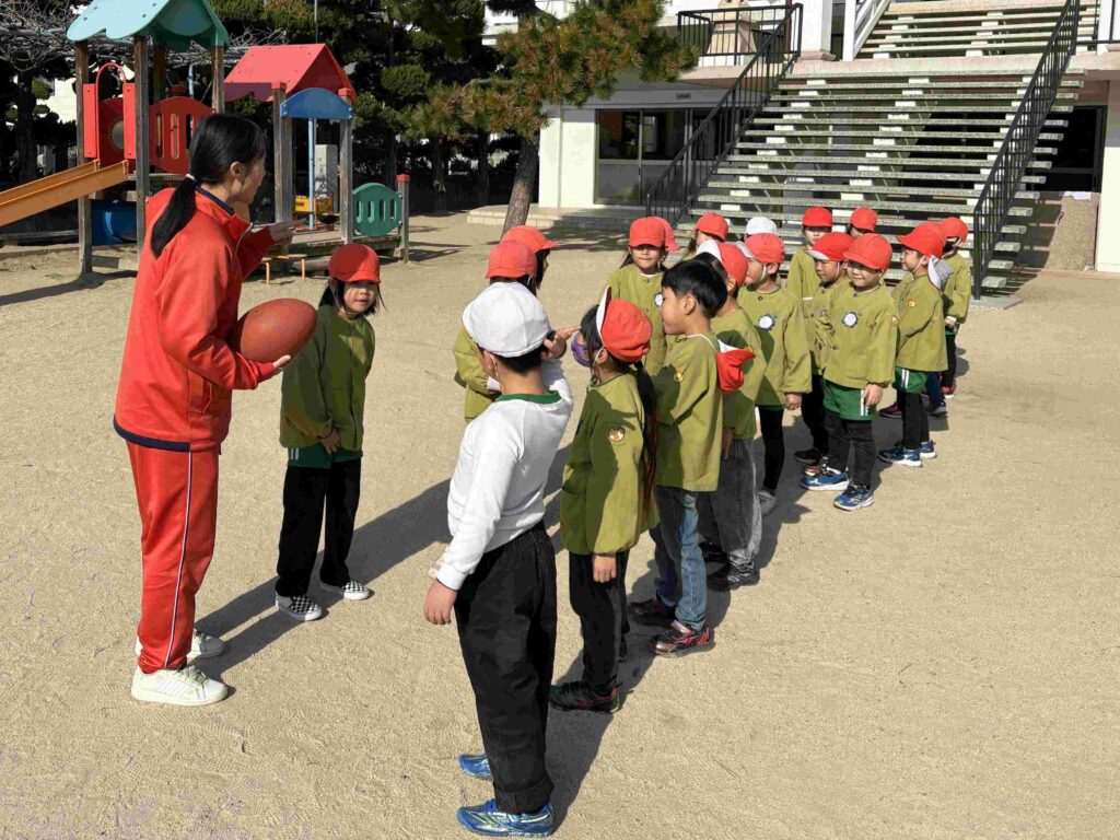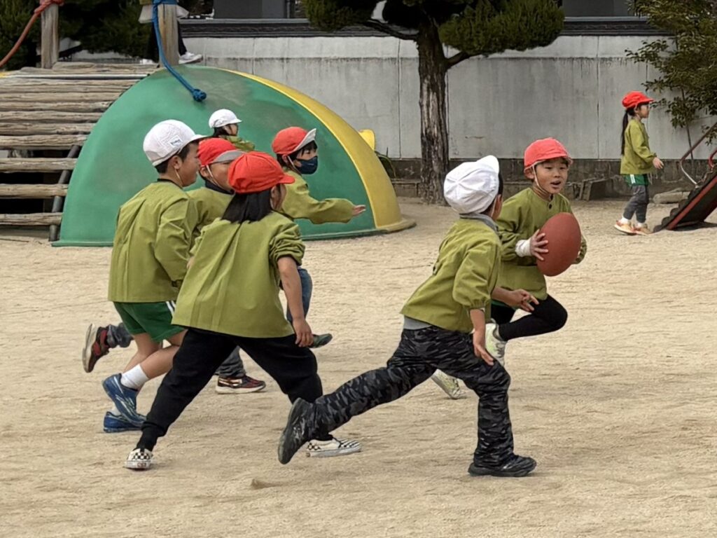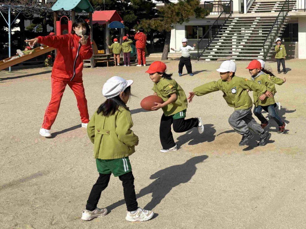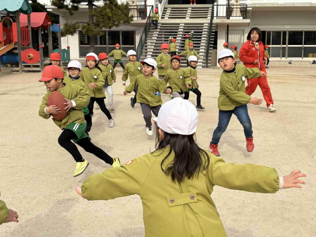 2026.01.20 ラグビー 年長組の子どもたちは、冬の寒い時期、ラグビーに取り組んでいます。 ラグビーは基礎が大切。基礎練習でだ円形のボールになれていきます。 毎日のお外遊びの時間。ラグビーをしたがる子が多くなっています。 ラグビーはチームメートとの協力が大切。声をかけあって取り組んでいます。 子どもたちは、ラグビーが大好き。いつも熱中して遊んでいます。 来月には、港町グラウンドでクラス対抗のラグビー大会が行われます。 2月20日のラグビー大会までちょうど1ヶ月。優勝目指して、がんばるぞ。 前の記事へ 一覧に戻る 次の記事へ