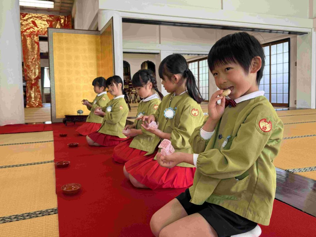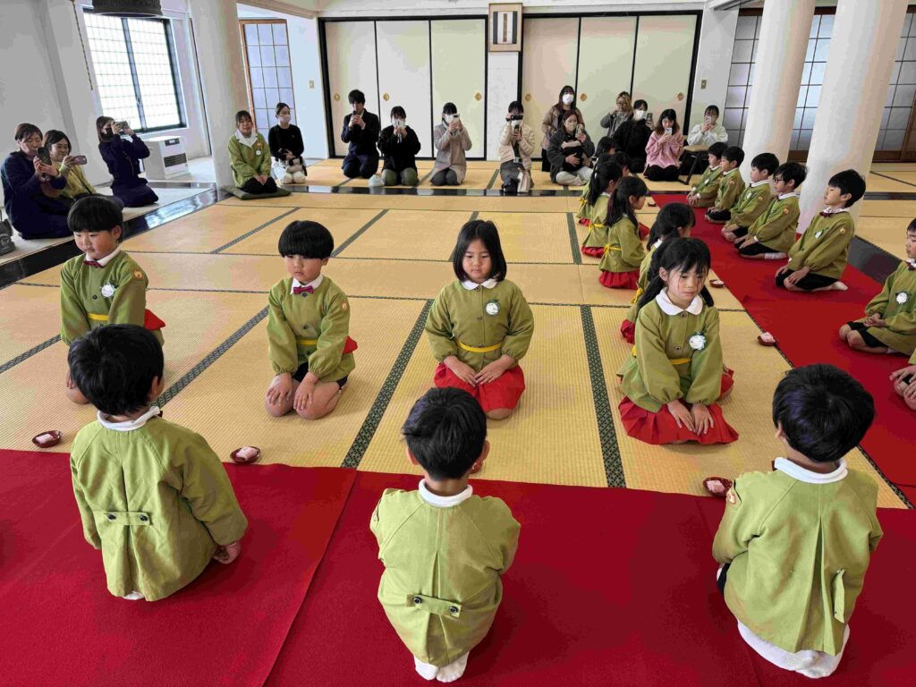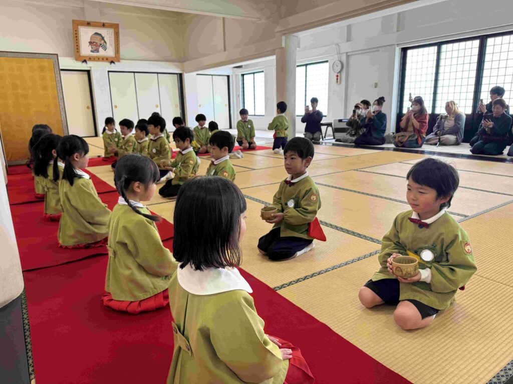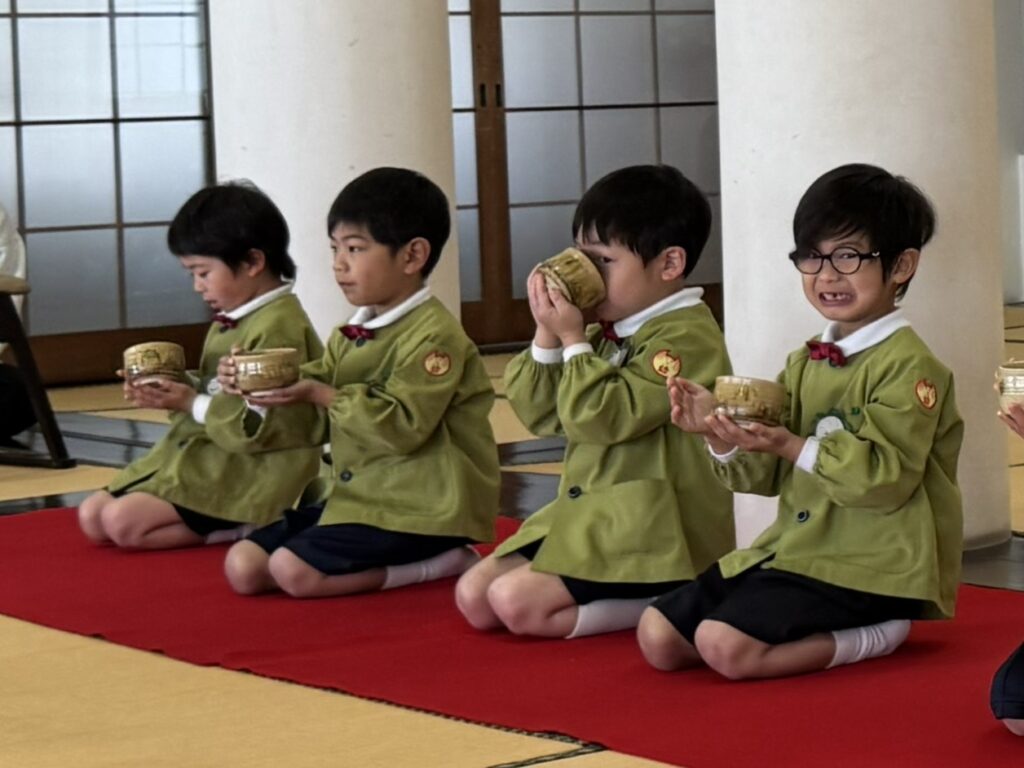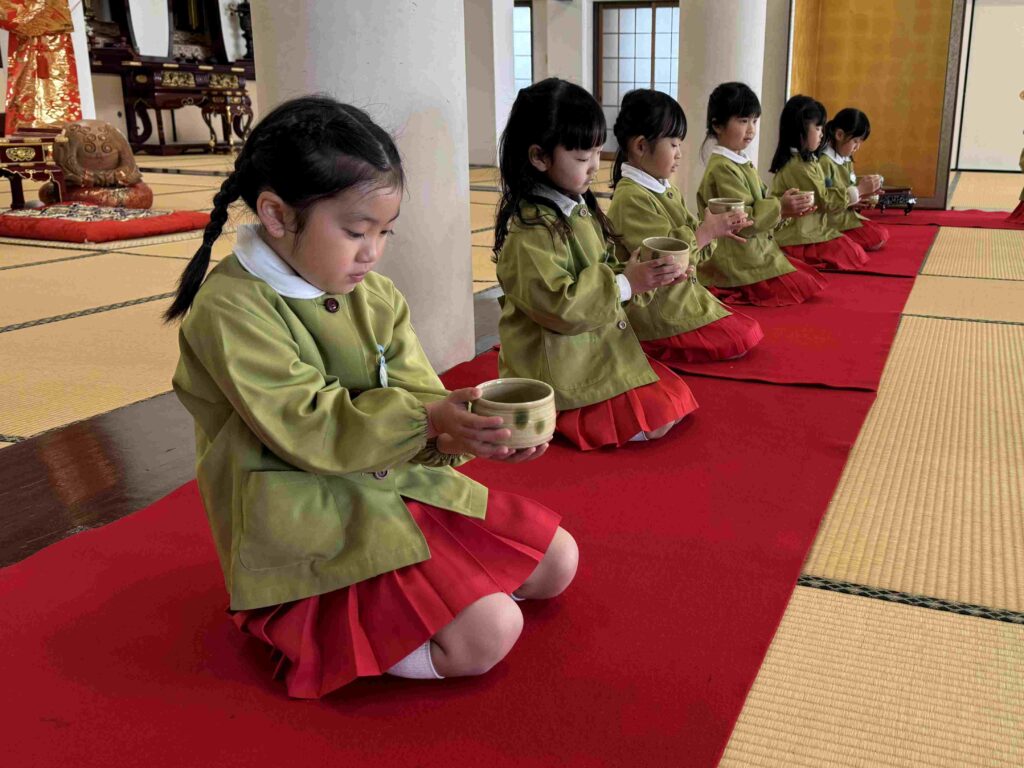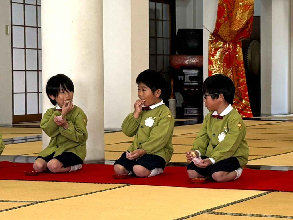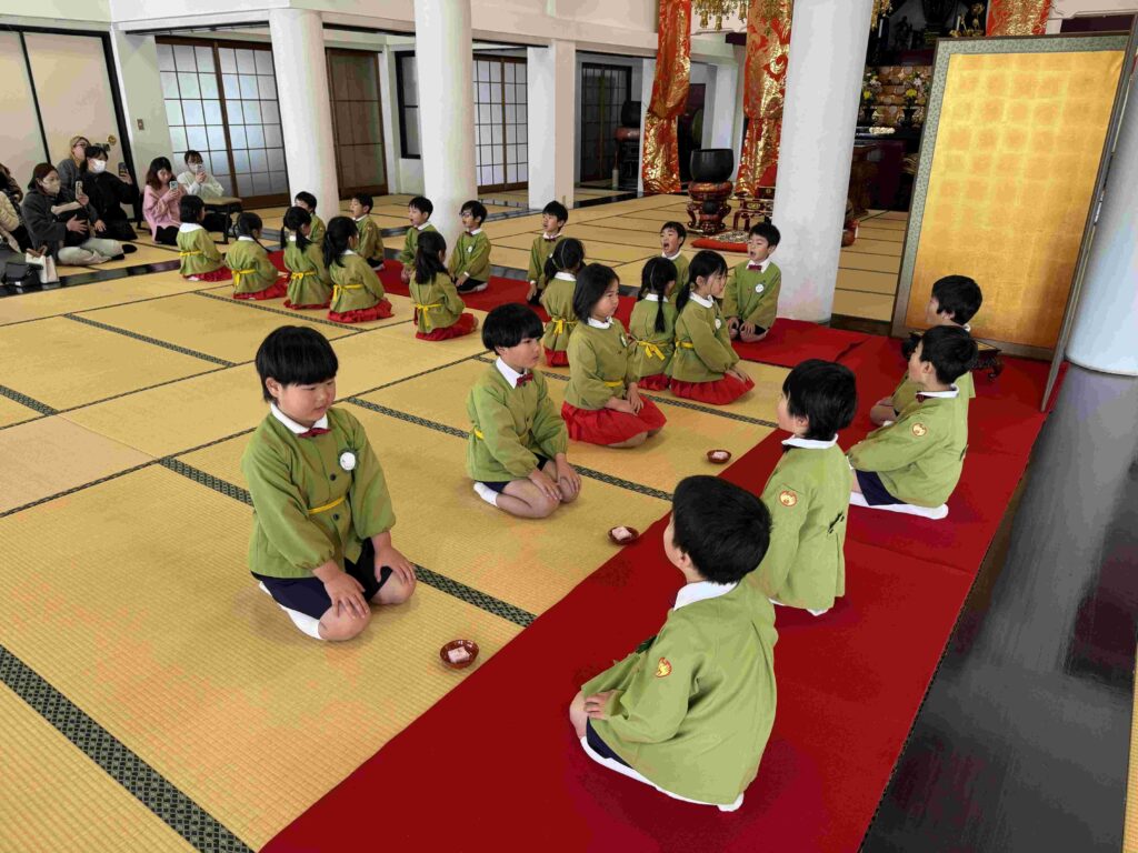 2026.03.06 卒園茶会 卒園を迎える年長組の子どもたちが、賢忠寺の御本堂でお茶会をしました。 子どもたちは、お運びさんとお客様に分かれて、お茶会をおこないます。 お茶会の和菓子、おいしくいただきます。 お稽古の時には飲まなかったお抹茶を今日はいただきます。少し苦かったみたいです。 幼稚園のいい思い出になりました。 前の記事へ 一覧に戻る