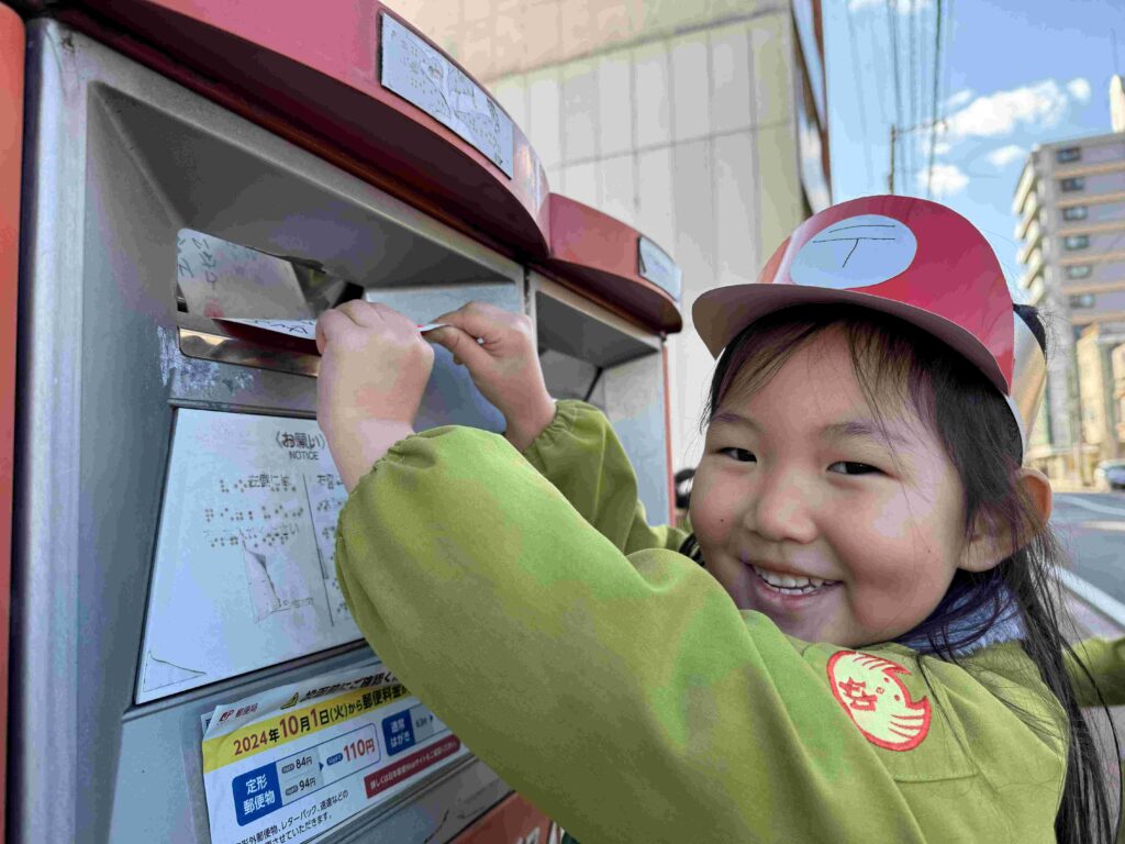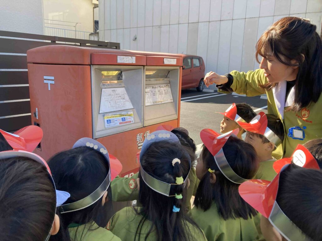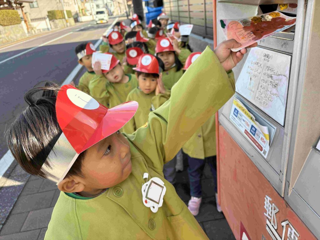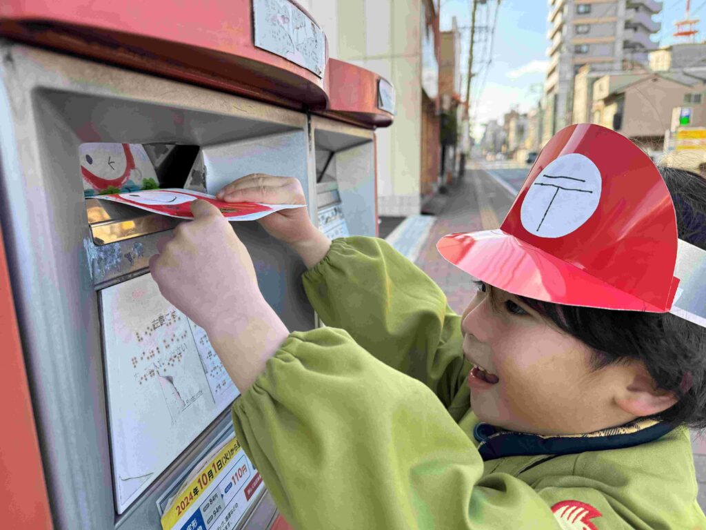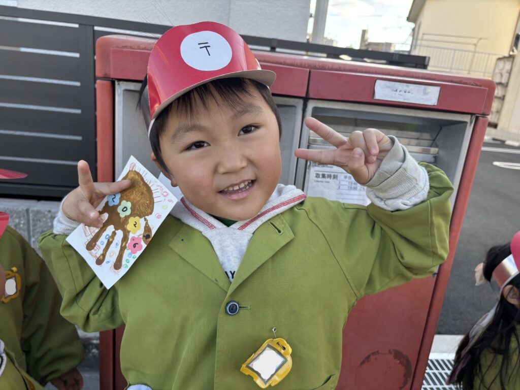 2025.12.15 年賀状 ひらがなを書いて、ご家族の皆様に出す年賀状に取り組みました。 幼稚園では、1年間ひらがなの練習を頑張ってきました。 年賀状完成。子どもたちの個性が出た素敵な年賀状です。 子どもたちが、かわいい帽子をかぶって、郵便屋さんに変身。 幼稚園の近くにある郵便ポストに、年賀状を投函しに行きます。 まずは、郵便ポストを観察します。投函口を確認。 ひとりひとり、丁寧に年賀状を投函します。1月1日にお家に届けてください。 お正月には、家族の皆さんと年賀状を見てね。 前の記事へ 一覧に戻る 次の記事へ