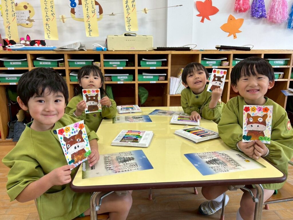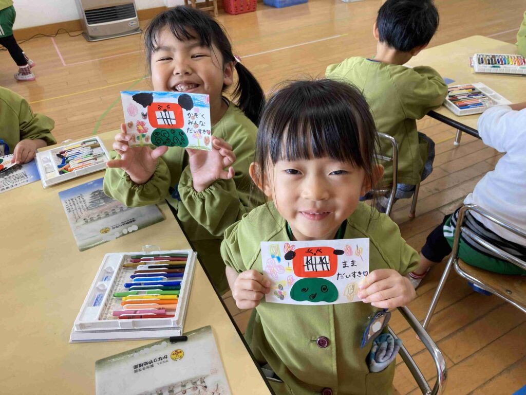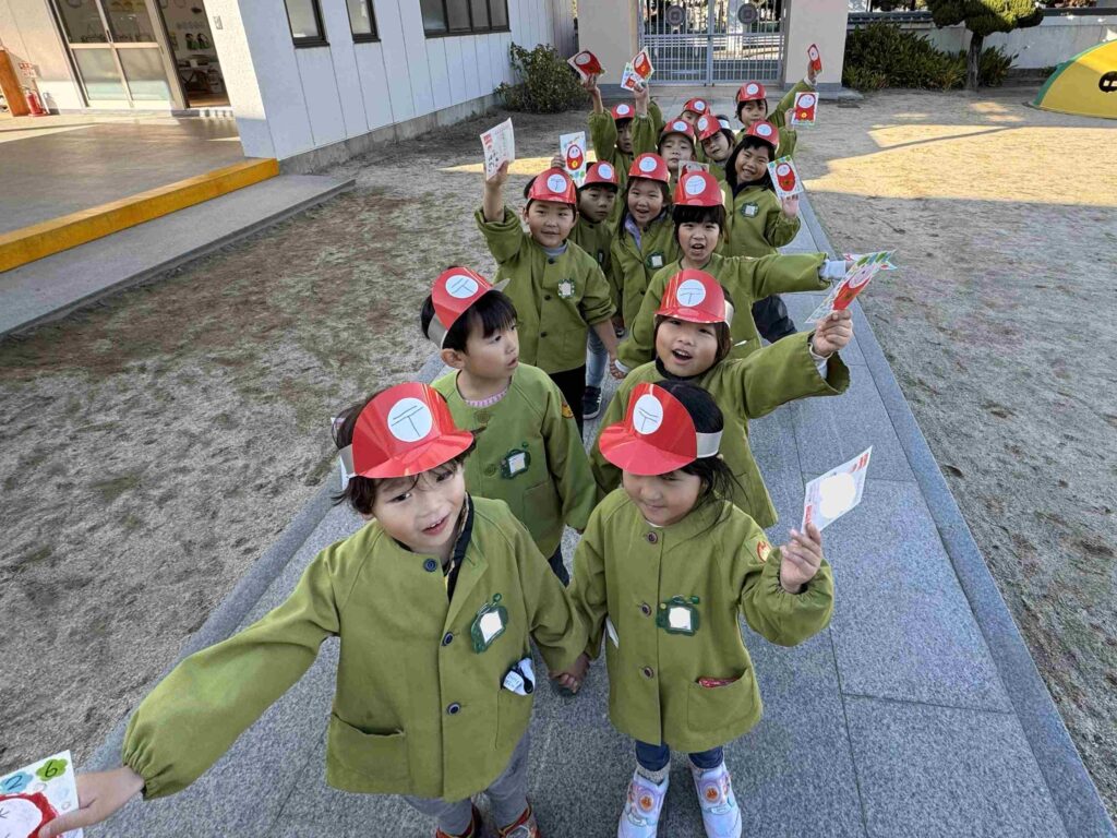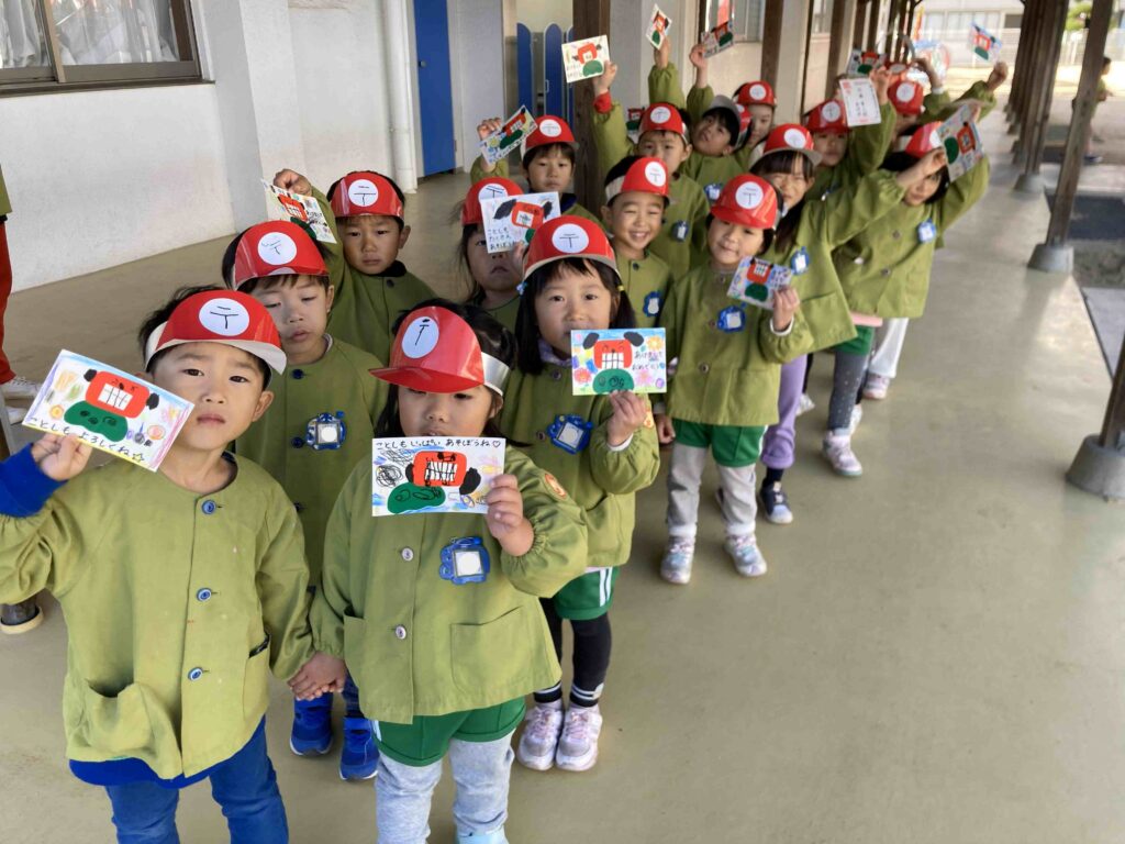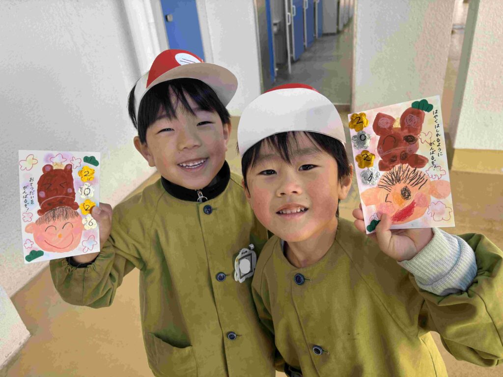 2025.12.15 年賀状 ひらがなを書いて、ご家族の皆様に出す年賀状に取り組みました。 幼稚園では、1年間ひらがなの練習を頑張ってきました。 年賀状完成。子どもたちの個性が出た素敵な年賀状です。 子どもたちが、かわいい帽子をかぶって、郵便屋さんに変身。 幼稚園の近くにある郵便ポストに、年賀状を投函しに行きます。 まずは、郵便ポストを観察します。投函口を確認。 ひとりひとり、丁寧に年賀状を投函します。1月1日にお家に届けてください。 お正月には、家族の皆さんと年賀状を見てね。 前の記事へ 一覧に戻る 次の記事へ